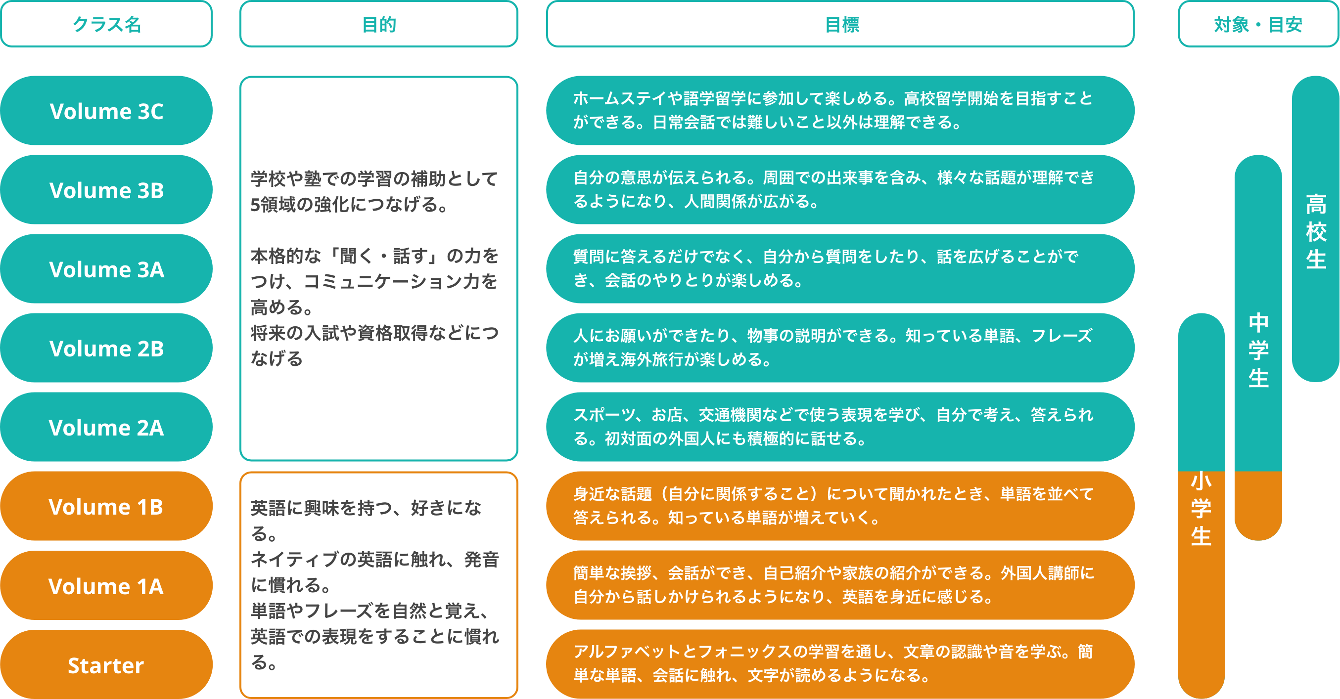 レベル分けされた8つのクラスがあり、英語初学者からCEFR A2(英検® 準 2 級程度)までをカバーします。
